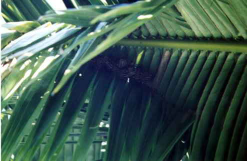 Some bats hanging around on a palm just outside our tent.